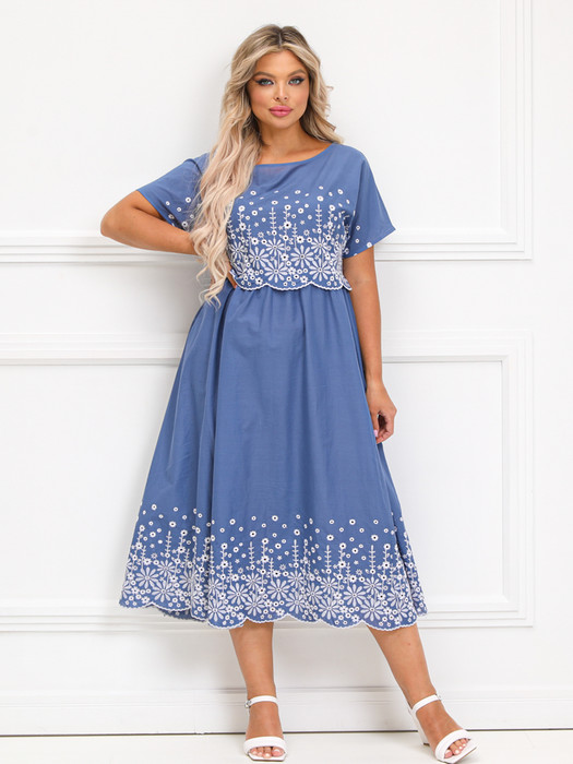 Восхитительное платье полуприлегающего силуэта из текстильной ткани синего цвета с вышивкой. Круглый вырез изделия обработан окантовкой. Платье с цельнокроеными рукавами. Линия талии завышена, эффектно подчеркнута сборкой. Длина изделия по спинке от плечевого шва до низа изделия — см. Рост фотомодели — 170 см.