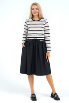 Стильное платье прямого силуэта. Платье выполнено из хлопковых нитей черного цвета с тонким плотным переплетением. Круглый вырез обработан подвязом. Платья дополнено вывязанным контрастным рисунком. Длина изделия по спинке от плечевого шва до низа изделия — 120 см.