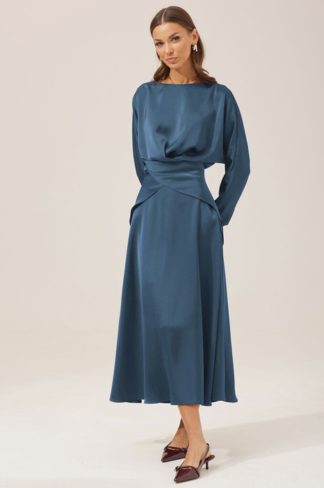 Юбка полуприлегающего силуэта расширенная книзу из струящейся ткани. По верху юбки притачной пояс. В 50-54р  на спинке в пояс вставлена эластичная тесьма(резинка). В левом боковом шве потайная молния.