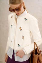 Жакет женский удлиненный, из текстильной ткани, на подкладке, полуприлегающего силуэта с центральной бортовой застежкой на пуговицы до линии перегиба лацкана. Спереди рельефные швы от плечевого шва, отрезной бочок и карман с клапаном. Спинка с рельефами от плечевого шва. Рукав втачной, двухшовный. Воротник пиджачного типа. Длина по спинке 66 см, длина рукава 62 см.