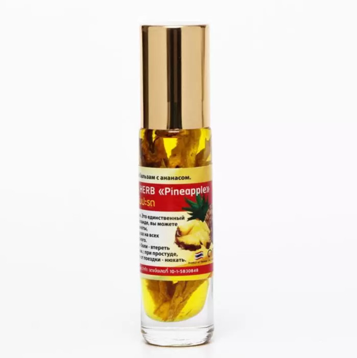 Banna Oil Balm With Herb Pineapple – это тайский жидкий бальзам с эфирными маслами и ананасом, популярное натуральное средство от укачивания, головной боли и насморка, очень приятно пахнущий и дополнительно настоянный на свежем ананасе.В составе ингалятора с ананасом 3 вида эфирных масел - камфорное, эвкалиптовое и ментоловое плюс тонко нарезанные свежие кусочки ананаса.• Камфорное масло оказывает тонизирующие действие и улучшает вентиляцию легочных альвеол, облегчая дыхание• Масло эвкалипта обладает антисептическим и противовоспалительным свойствами• Ментоловое масло поможет избавиться от головной боли• Ананас содержит множество витаминов и полезных веществ. Масло ананаса увлажняет и питает кожу. Поможет расслабиться после трудного дня, успокоиться и снять стресс.Стеклянный карандаш с шариком на конце. Имеет приятный ананасовый аромат.Применяют тайский ингалятор с ананасом при начинающемся насморке и простуде, при синдроме морской болезни, простуде, пневмонии, тайский ингалятор полезно вдыхать при гриппе, бронхите, синусите и астме.Тайский ингалятор с ананасом поможет не только при заболеваниях дыхательных путей, но и при бессоннице, вялости и расстройствах нервной системы.Способ применения тайского ингалятора с ананасом:• Головная боль – втирать в виски.• Насморк – нанести на кожу под носом, смазать крылья носа.• Тошнота, головокружение – виски, переносица.• Повышенное давление – нанести на затылочную кость.• После применения не забывать закрывать крышку – эфирные масла очень быстро испаряются.