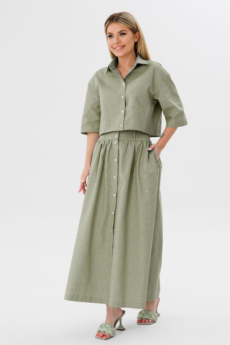 Рубашка укороченная, свободного силуэта,с центральной бортовой застежкой на петли пуговицы. Воротник на стойке отложной, рукав короткий.