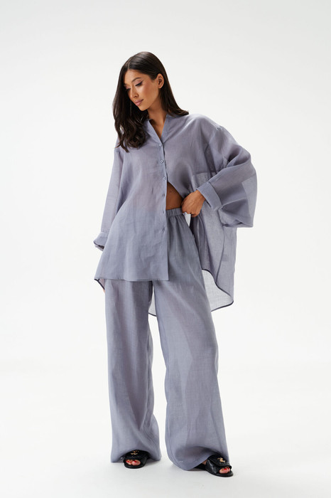 Рубашка свободного кроя выполнена из натурального полотна приглушенного голубого цвета. Характеристики: рубашка прямого свободного кроя, горловина стойка. Застежка центральная на петли пуговицы, рукав акцентный объёмный, крой рукава летучая мышь, спинка отрезная с декоративной сборкой. Длина по спинке 80 см, длина рукава от горловины 76 см.