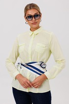Рубашка прямого свободного кроя. Выполнена из мягкого текстильного полотна цвета серый меланж. Воротник отложной. Застёжка центральная на пуговицы. По переду на уровни линии груди функциональные карманы. Рукав спущенный, свободный, с манжетой на пуговице. Спинка отрезная. Длина рукава от края горловины 80 см. Спинка отрезная со сборкой. Длина спинки 76 см