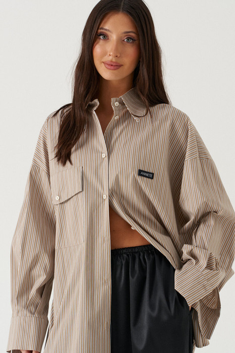 Рубашка прямого свободного кроя, выполнена из полотна цвета капучино в бело-черную полоску. Характеристика: воротник отложной, застёжка центральная на пуговицы, по переду справа на уровне линии груди накладной карман, слева - брендированная нашивка Annete, рукав спущенный свободный, с широкой манжетой на пуговице, спинка отрезная с скоалками. Длина рукава от края горловины 78 см. Длин по центру спинки от края горловины 77 см.