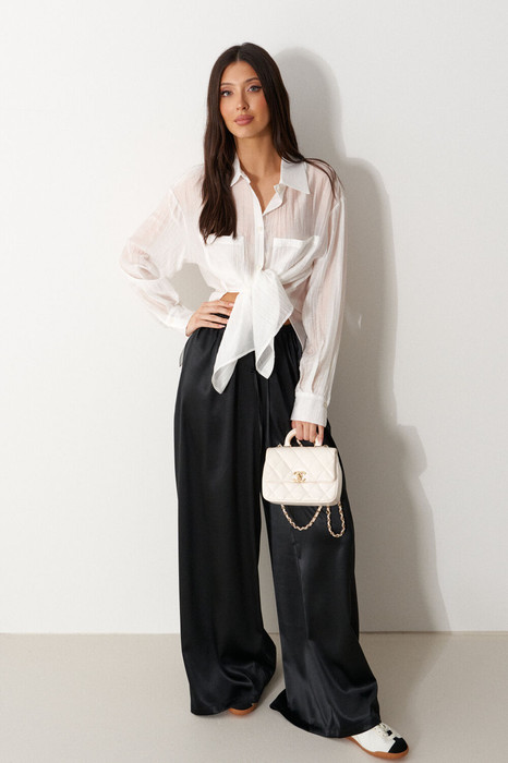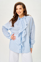Блузка женская прямого силуэта, свободного облегания. Характеристика: Воротник отложной на стойке. Рукав одношовный, втачной, со спущенной линией плеча. На переде по линии груди настрочены прямоугольные накладные карманы. Спинка цельная. В боковых швах обработаны разрезы. Застежка центральная, цельнокроеная планка, застегивающаяся на пробивные петли, пришивные пуговицы. На манжетах декоративная пуговица. Длина рукава 60 см, длина плеча 20 см, длина блузы по спинке 69 см.