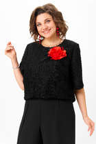 Блузка прямого свободного кроя, выполнена из полотна черного цвета в светлую полоску. Характеристики: прямой крой, воротник отложной, застежка центральная на пуговицы, в боковых швах разрез 20см, плечо спущенное, рукав втачной широкий, спинка отрезная. Длина изделия по центру спинки 75 см. Длина рукава от края горловины 77см.