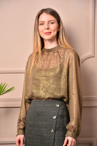 Блузка женская прямого силуэта выполнена из блузочной ткани с добавлением эластана, с отрезным карманом на одной полочке и отрезной планкой на другой. Застежка центральная на петли и пуговицы, воротник рубашечного кроя. Длина блузки по спинке 80 см, рукава 50 см.