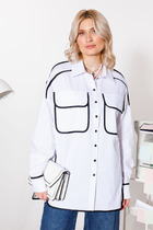 Рубашка женская свободного силуэта "оверсайз". Воротник отложной на стойке. По груди расположены накладные прямоугольные карманы на пуговицах. Рукав одношовный спущенный, с патами по локтям. Застежка по переду потайная, на пробивные петли и пришивные пуговицы.
