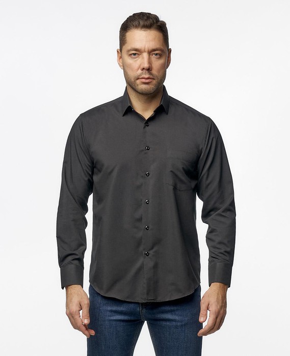 Мужская однотонная рубашка классического кроя, с длинным рукавом, один накладной карман, застегивается на пуговицы.