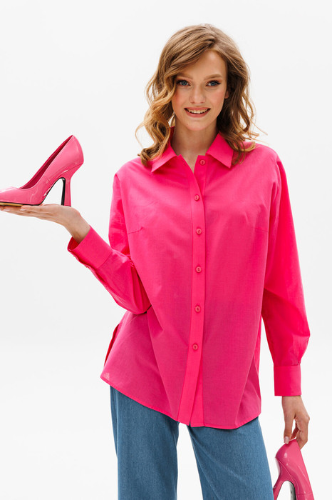 Блузка выполнена из плательно-блузочной ткани. Блузка прямого силуэта покроя оверсайз, длиной до линии бедер. Спереди центральная застежка до верха на пуговицы. Спинка цельная. Горловина округлой формы со стояче-отложным воротником. Плечевой шов спущенный. Рукав рубашечного покроя, одношовный. Низ рукава на притачной манжете. В боковых швах разрезы.
