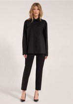 Рубашка свободного кроя без вытачек с накладными карманами. Воротник рубашечного типа с отрезной стойкой и застёжкой на петли и пуговицы по планке. Модель привлекает внимание различным направлением полос на деталях переда. Рукава втачные одношовные.