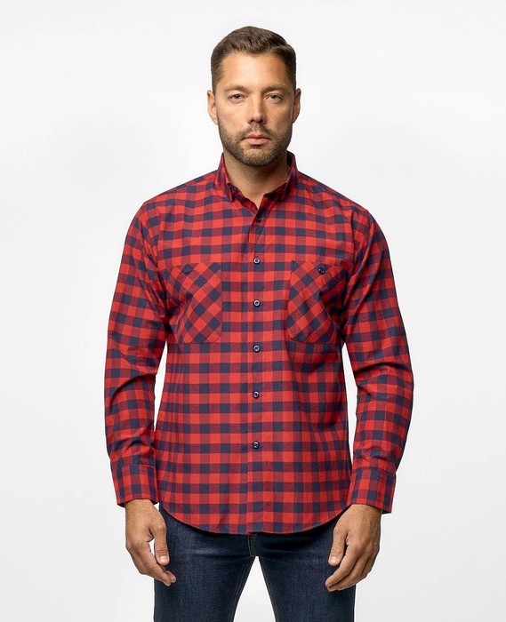 Мужская рубашка в клетку прямого классического кроя, с длинным рукавом, застегивается на пуговицы, предусмотрены два функциональных нагрудных кармана.