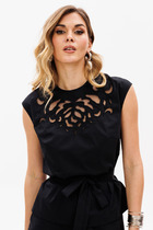 Блуза женская, прямого силуэта с потайной застежкой. Перед с нагрудными вытачками. Спинка с отрезной кокеткой. Воротник рубашечного типа, с отрезной стойкой. Рукав тачной, одношовный, с манжетой по низу. Низ фигурный. Декоративный цветок (съемный, пуговица)