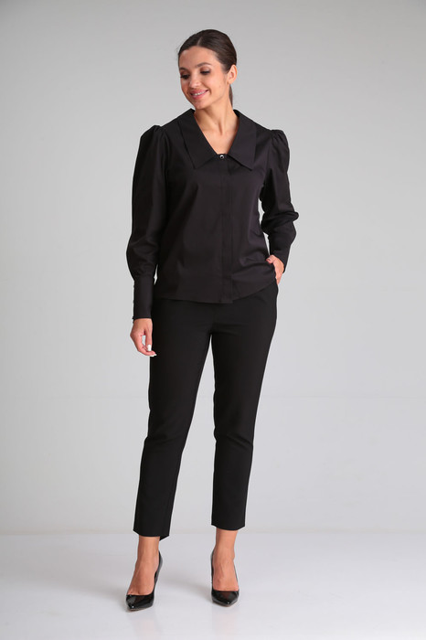 Стильная блузка прямого силуэта из ткани содержащей хлопок. Изделие с горловиной V-образной формы и отложным воротником. Передняя часть блузки с потайной застежкой на пуговицы и одной декоративной пуговицей. Рукав втачной со сборкой по окату и притачной широкой манжетой с застежкой на три пуговицы. Спинка изделия цельная.