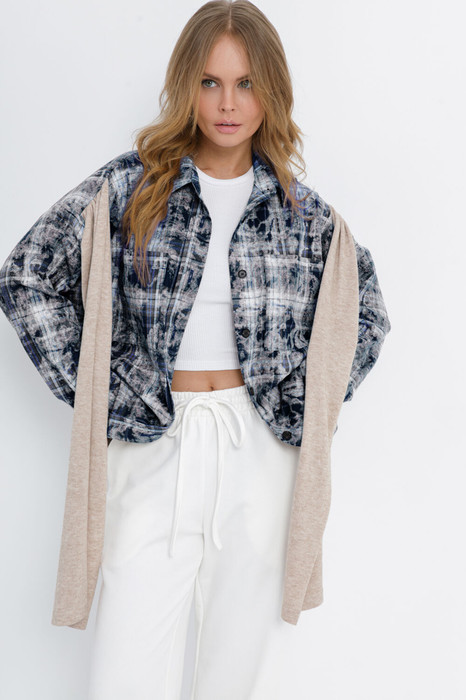 Детали: прямой силуэт, спущенная линия плеча, накладные карманы, застежка на петли и пуговицы, удлиненные рукава с притачными манжетами. Имитация рукавов из трикотажа.