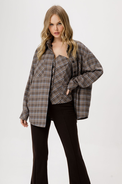 Детали: прямой силуэт, свободный покрой, рубашечный воротник, застежка на петли и пуговицы, перед с накладными карманами, спинка с кокеткой, рукава длинные с манжетами.