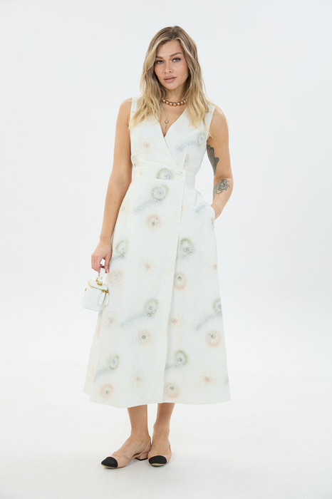 Сарафан "макси" без рукавов с застёжкой на запах на функциональные петли и пуговицы. Вырез декольте V-образный. По линии талии спинки эластичная вставлена эластичная резинка. При надобности, платье легко слегка расширить или заузить по талии, переставив пуговицы.
