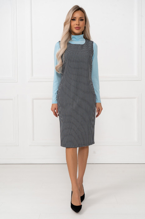 Этот серый сарафан из текстиля с узором \"гусиная лапка\" выполнен в полуприталенном силуэте, который красиво выделяет фигуру. Для удобства надевания предусмотрена молния на спине, а разрез снизу обеспечивает дополнительную свободу движений. Элегантный дизайн и комфорт этого сарафана делают его универсальным выбором для разнообразных повседневных ситуаций.