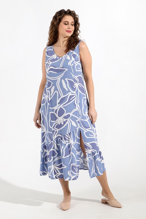 Сарафан женский из тканого штапельного полотна с набивным рисунком, удлиненное свободного силуэта, без рукавов, с рельефными швами, выходящими из пройм. По нижнему косому срезу притачная оборка и разрез в левом рельефном шве. Проймы и V-образная горловина окантованы основным материалом.