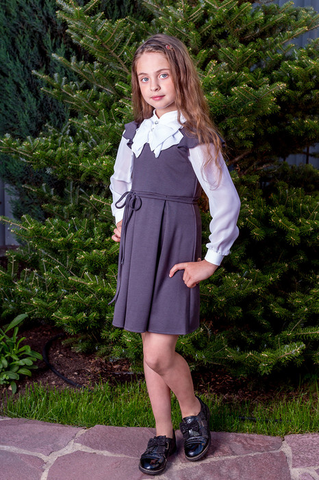 Сарафан с "встречными" складками,с "крылышками" и узким пояском, будет прекрасным дополнением в гардеробе школьницы. Застежка на пуговицах.
