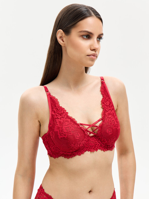 Бюстгальтер модели Soft bra with wire с мягкими чашками, на каркасах, с боковыми корсетными вставками, выполнен из нежного кружева вишневого цвета с дубляжом из сетки.  Переднюю часть лифа украшают стрепы с колечками в цвет изделия. Широкие кружевные бретели в передней части лифа переходят в регулируемые бретели на спинке. Ширина бретелей во всех размерах 10 мм.Застежка на 2 крючка и 3 ряда петель. Размерная сетка 70A, 70B, 70C, 75A, 75B, 75C, 75D, 80B, 80C, 80D, 85B, 85C