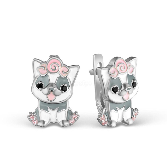 Серьги детские из серебра с эмалью и фианитами родированные - Собачки