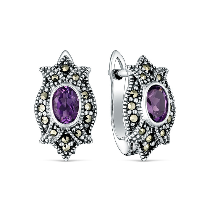 Серьги из чернёного серебра с натуральным аметистом и марказитами 925 пробы HE03