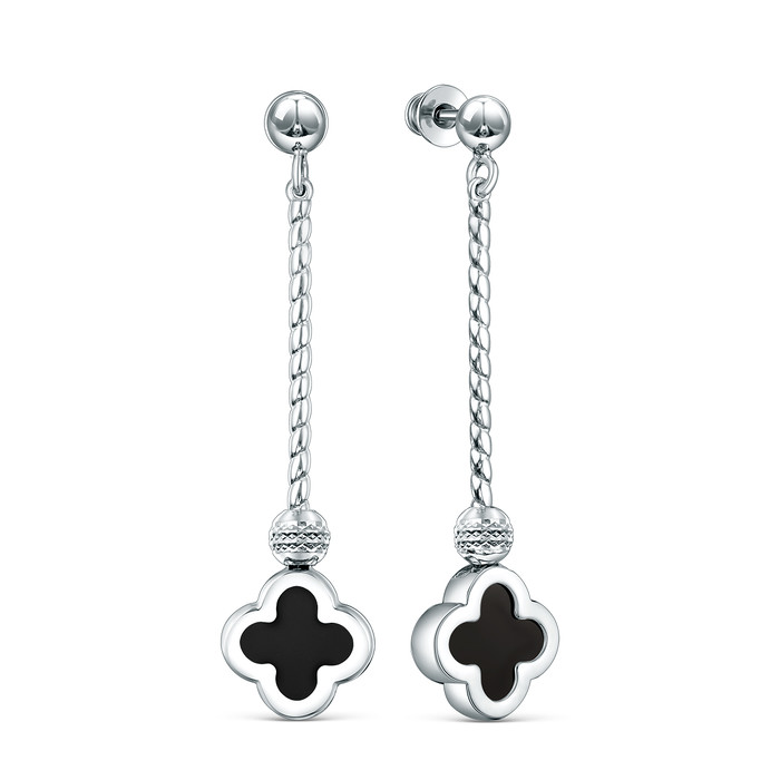 Серьги-пусеты длинные в форме клевер из серебра с камнем оникс коллекция Clover