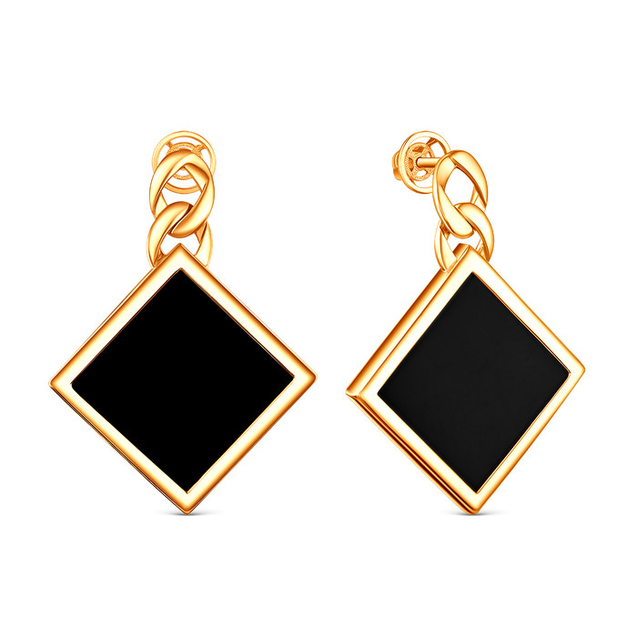 Серьги-пусеты из золочёного серебра с натуральным ониксом - Ромбы 925 пробы С-40