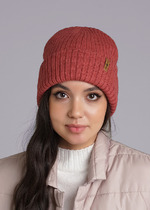 Шапка женская ластичного переплетения, декорирована нашивой логотип. Утепление флисовым подкладом по всей голове. Подойдёт для холодной зимы.