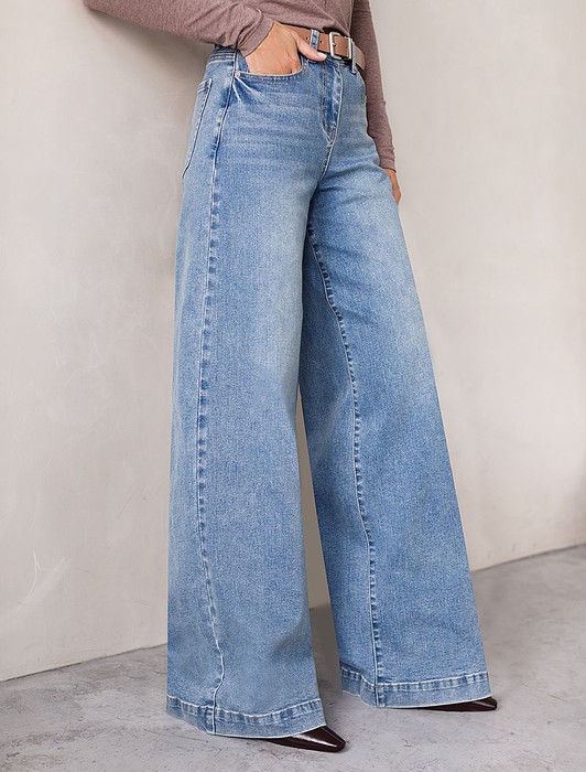 Широкие джинсы с декоративной стиркой из эластичного плотного денима