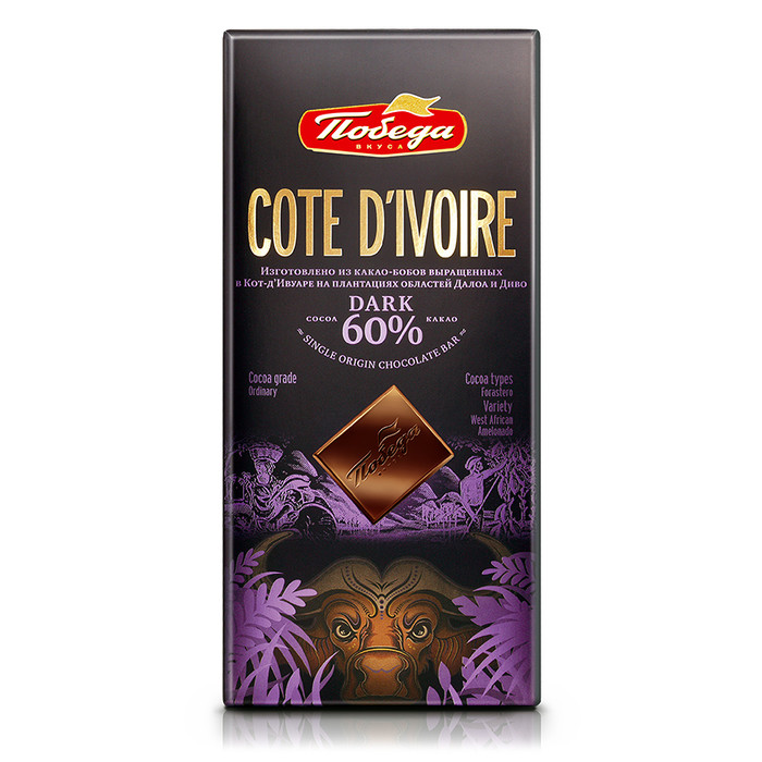Шоколатье описал бы профиль вкуса для шоколада «Кот-Д’Ивуар» 60 % так: премиальный горький шоколад с классическим ярким ароматом какао. Вкус со сбалансированной горчинкой раскрывается нотками кокоса, табака, обжаренного хлеба и специями муската и кардамона. Послевкусие долгое, обволакивающее. Для влюбленных в шоколад.