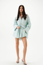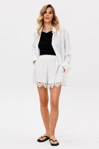 Шорты свободного кроя. Выполнены из хлопкового полотна песочного цвета в полоску. А-силуэт. Пояс на резинке. По передней части имитация застежки на 3 пуговицы. Карманы-хулиганы. По передней и задней части вертикальные швы. Длина 37 см