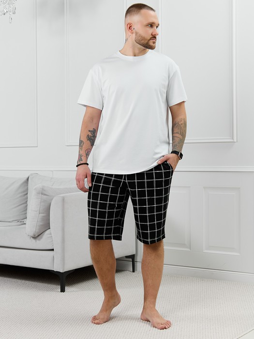 Шорты мужские из трикотажного полотна "кулирка" в клетку, свободного покроя, на притачном поясе с эластичной тесьмой внутри, с карманами в боковых швах. Нижние срезы обработаны подгибкой.