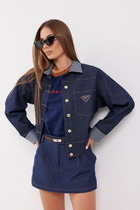 Шорты укороченные из джинсовой ткани. Верх на поясе со шлёвками. Застёжка спереди на металлическую молнию, петлю и пуговицу на поясе. Боковые наклонные карманы. По переду имитация юбки. Задние части декорированы листочками и фирменным знаком.