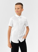 Сорочка для мальчика из смесового хлопка полуприлегающего силуэта. На спинке - кокетка. Воротник отложной со стойкой. Левая сторона полочки дополнена накладным карманом. Карман вверху декорирован принтом. Застёжка по центру переда на молнию. Рукава рубашечные со шлицами и манжетами.