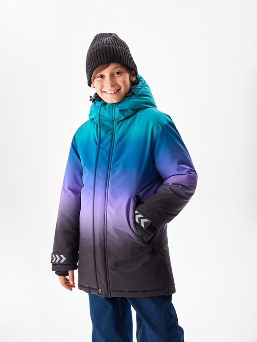 Зимняя куртка прямого кроя для мальчиков с водонепроницаемым покрытием на молнии в градиентной расцветке и с трендовой нашивкой на левом рукаве. Утеплитель пластовой синтепон пластовой к основн ткани - 50  гр/м2,  биопух к подкладке- 250 гр/м2, мембрана. Манжет рукава с прочной внешней поверхностью и мягким внутренним слоем с велюровым ворсом. Температурный режим до минус 30 градусов. Карманы на молниях обеспечивают удобство для хранения мелочей. Надежная фурнитура: прочные застежки и молнии, которые обеспечивают долгий срок службы.  Застежка - намолнию закрыта ветрозащитной планкой на кнопках. Воротник - стойка, переходящая в капюшон. Доступна в 2 цветах.