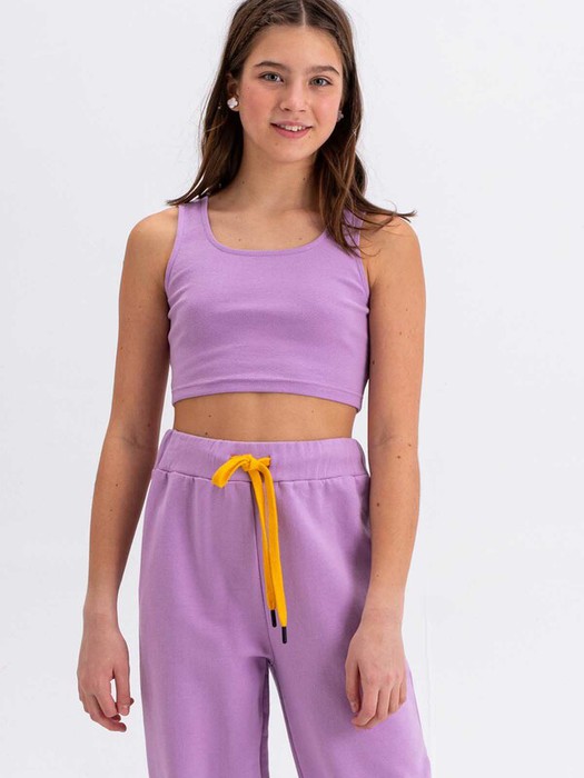 Удобный базовый облегающий топ для девочки, укороченный, с широкими лямками. Выполнен из эластичного трикотажного полотна.