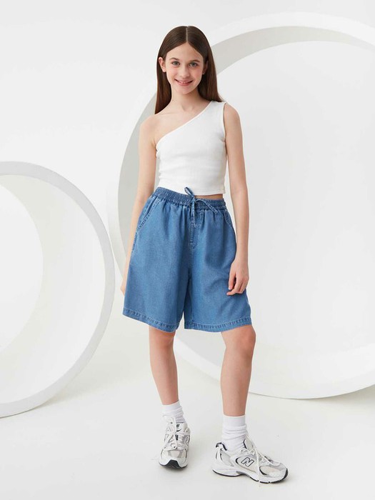 Удлиненные джинсовые шорты из лиоцелла прямого кроя. Средняя посадка с широким поясом на резинке, боковые карманы. По поясу расположен декоративный рулик в качестве завязки, что добавляет комфорта в носке. Размерный ряд 128 – 176 см.
