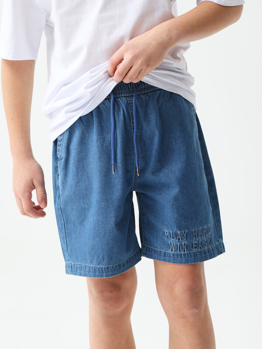 Удлиненные джинсовые шорты прямого кроя. Легкий деним 5 унций из 100% хлопка. Средняя посадка с широким поясом на резинке, боковые карманы. По поясу расположен рулик в качестве завязки, что добавляет комфорта в носке. По низу нанесен принт «Playhardwineasy». Представлены в двух цветах – синий и серый. Размерный ряд 128 – 176 см.