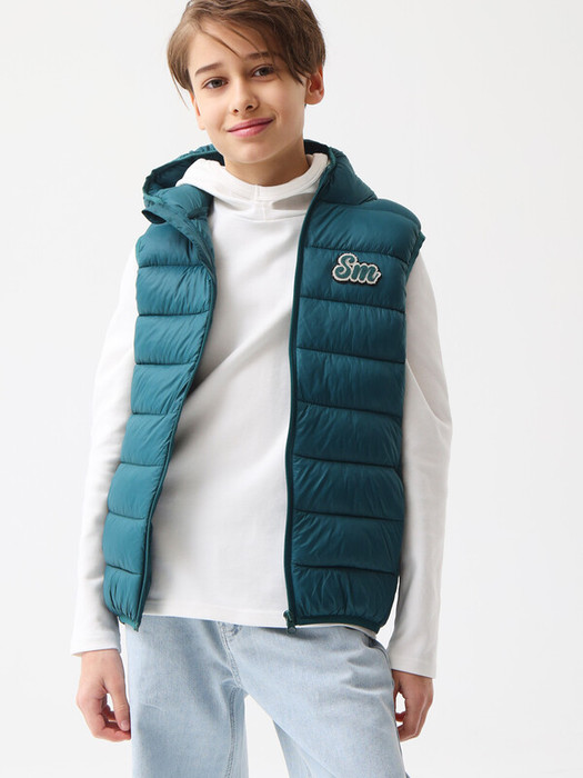 Демисезонный двусторонний стеганый жилет с утеплителем из синтепона, выполненным из экологичных и переработанных материалов. Прямой крой, капюшон и воротник-стойка, застежка-молния. Прорезные карманы на молнии, внутри - флис. На груди фирменный патч «Sm». Размерный ряд 128 – 176 см.