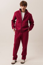 Спортивный костюм из хлопкового трикотажного полотна. Кокетки на куртке выполнены из ткани контрастного цвета. В швах притачивания кокеток проложен кант белого цвета. Карманы на куртке и брюках прорезные с листочками на молнии. Листочки выполнены из полотна контрастного цвета с белыми кантами. Посадку по фигуре обеспечивает эластичная рибана по воротнику, поясу и манжетам. Брюки прямые с накладным карманом на задней половинке. Пояс по линии талии регулируется шнурком. На брюках и полочке настрочен шеврон с фирменным логотипом.
