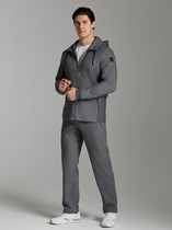 Мужской спортивный костюм из эластичного хлопкового трикотажного полотна. Куртка прямая с воротником, застегивается на молнию. Рукава втачные. Воротник, манжеты и пояс куртки выполнены из эластичного трикотажа. Брюки прямого силуэта. Прорезные карманы куртки и брюк застегиваются на молнии. Пояс брюк эластичный, по линии талии дополнительно регулируется шнуром.