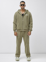 Спортивный костюм из хлопкового трикотажного полотна. Куртка костюма на поясе, с капюшоном, застегивается на молнию. Рукава втачные. Карманы на куртке и брюках прорезные с листочками на молниях. На куртке штрокая поперечная вставка на уровне груди окантована красным и белым кантами. Лицевая часть капюшона регулирется шнуром. Пояс и манжеты куртки изготовлены из эластичного подвяза с контрастными полосами. Брюки прямые. Пояс брюк по линии талии с эластичной резинкой так же дополнительно регулируется шнуром. На левом рукаве и под левым карманом нашиты шевроны с фирменным логотипом.