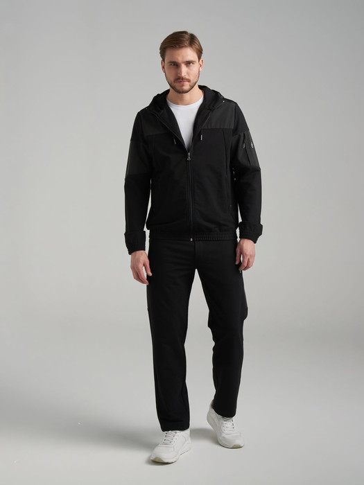 Спортивный костюм из хлопкового трикотажного полотна .Куртка костюма на поясе, с воротником-стойкой, с капюшоном, застегивается на молнию. Рукава втачные. Несколько деталей костюма изготовлены из водонепроницаемой плащевой ткани в тон изделия - это капюшон,кокетка куртки, вставка левого рукава и боковые вставки брюк. Карманы куртки и брюк с молниями, распологаются в рельефах. На рукаве куртки слева предусмотрен дополнительный карман, он также с молнией. Капюшон ветрозащитный, с высокой цельнокроенной стойкой. Пояс и манжеты куртки собраны на эластичную резину. Брюки прямые, зауженные книзу. Пояс брюк по линии талии так же с эластичной резинкой, дополнительно регулируется шнуром. На левом рукаве и под левым карманом брюк нашиты шевроны с фирменным логотипом.