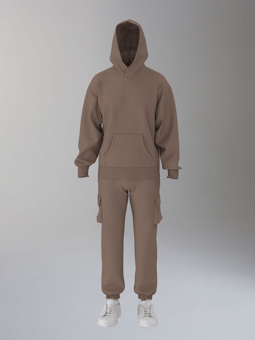Мужской спортивный костюм из плотного трикотажа с петельной изнанкой. Верх комплекта - толстовка-худи с капюшоном, с накладным карманом "кенгуру". Рукава толстовки втачные, свободные со спущенной линией плеча, с эластичными манжетами. На тактических брюках "Карго" два объемных накладных кармана с клапанамии и еще два кармана в боковых подрезах. Брюки зауженны книзу на резинку. Пояс брюк на резинке, по линии талии дополнительно регулируется шнуром.