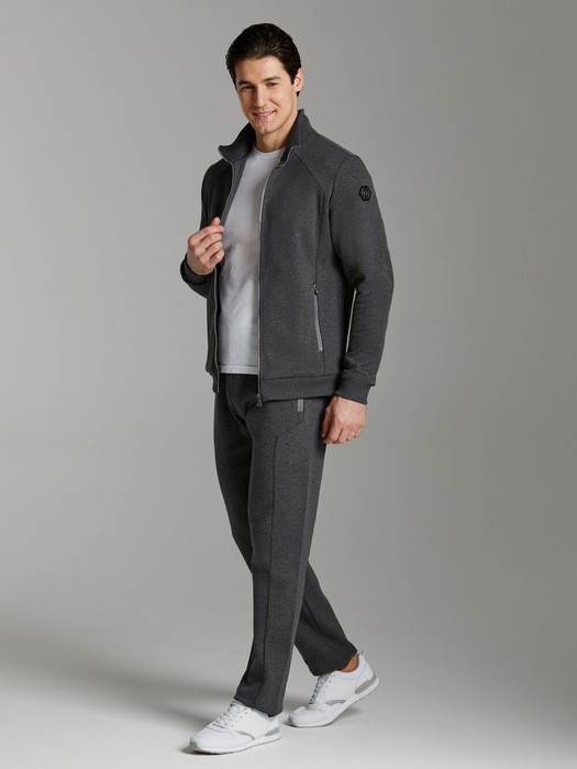 Современная модель мужского костюма из жаккардового трикотажного полотна. Куртка с капюшоном, на молнии, с карманом-кенгуру. Рукава покроя реглан, выполнены из контрастного трикотажного полотна. По низу куртки слегка заужен поясом, рукава с манжетами. Карманы брюк прорезные, наклонные. Низ брюк с манжетами. Пояс брюк эластичный, дополнительно регулируется шнуром. На слева на груди и на левой брючине под карманом - фирменный логотип. На правый рукав логотип нанесен методом термопечати.