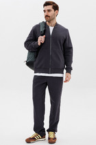 Спортивный мужской костюм изготовлен из легкой плащевой ткани с добавлением лайкры, которая при носке обладает упругим растяжением подобно трикотажному полотну. Куртка на молнии с воротником, с подкладкой из легкой трикотажной сетки. Куртка свободного силуэта, заужена книзу поясом из трикотажной резинки с полосками, воротник- стойка также выполнен из трикотажной резинки. . Карманы прорезные, с открытыми молниями. Крой рукава - втачной, низ рукава слегка заужен трикотажным манжетом с контрастными полосами. Слева на груди вышивка "герб России", На левом рукаве вышивка аппликация - флаг России, на спине надпись RUSSIA. Все вышивки выполнены цветными шелковыми нитями. Брюки костюма на сетчатой подкладке. Карманы брюк прорезные с открытыми молниями. Слева под карманом настрочен шеврон с фирменным логотипом.