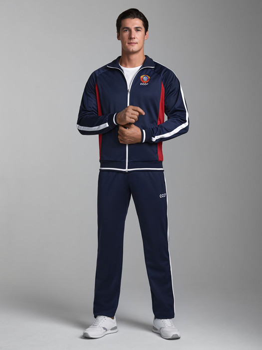 Спортивный костюм из полиэстеровой ткани с изнаночным начесом, в стиле ретро спорт. Карманы куртки и брюк прорезные с открытыми молниями. По рукавам и боковой стороне брюк лампасы белого цвета. Посадку по фигуре обеспечивает эластичная трикотажная рибана. Брюки прямого силуэта. Пояс по линии талии регулируется шнурком. На полочке выполнена вышивка герба СССР. На спинке аппликация букв СССР. На брюках вышивка букв СССР.
